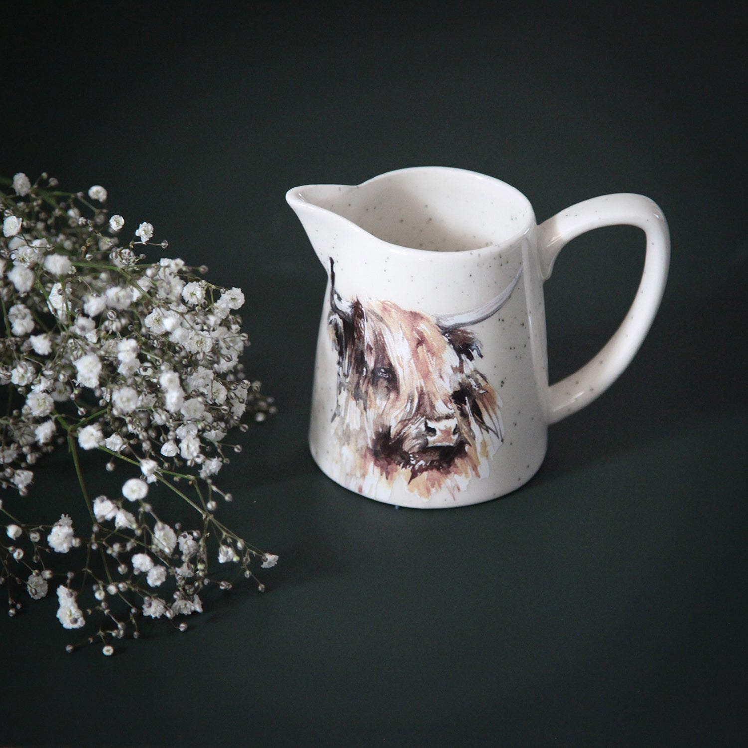 The jug showcases white, speckled ceramic, complete with a beautiful highland cow image from Meg Hawkins. It is completed by a matching integrated handle and spout. The jug is packaged in a brown box with colour label.