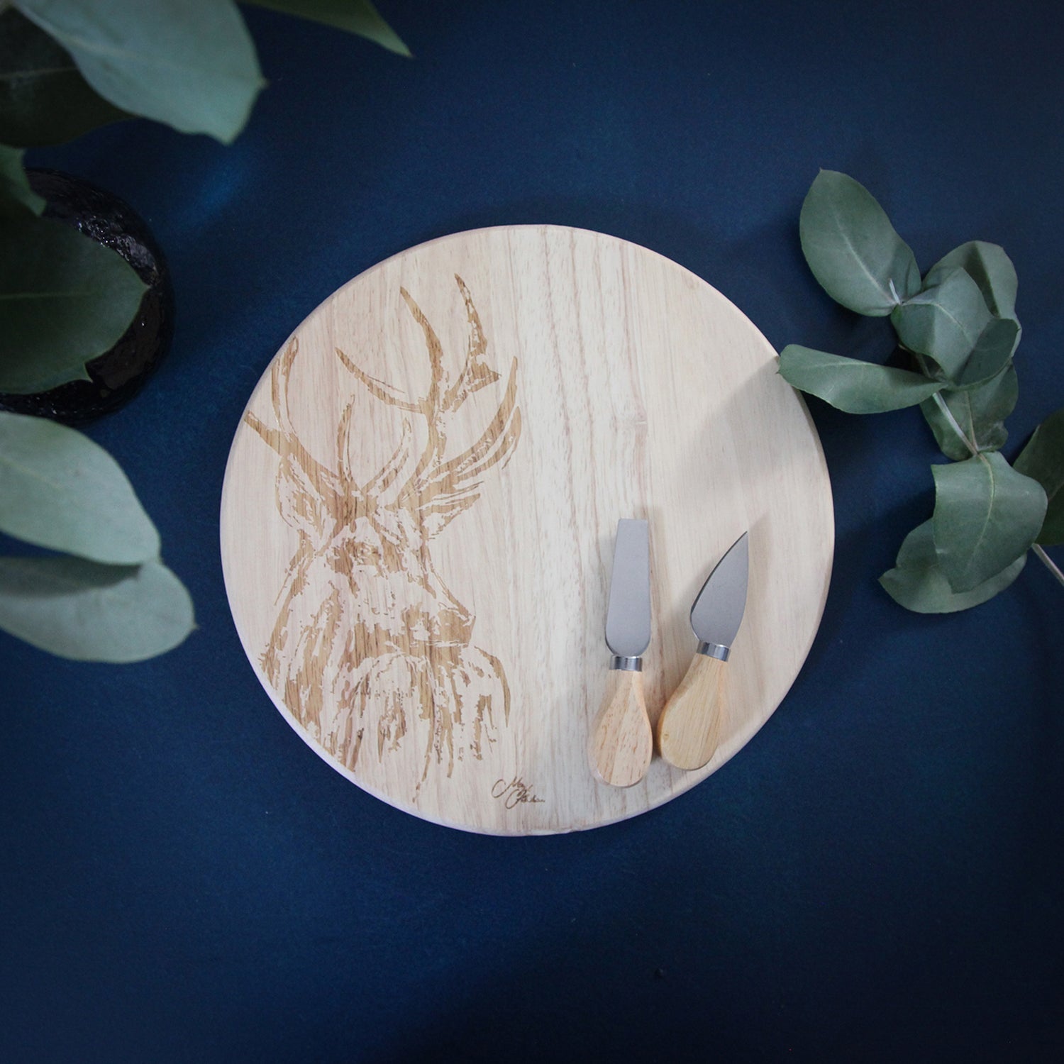 The round, wooden cheese board showcases a beautiful carving that depicts a stag, below which sits the Meg Hawkins signature. It is accompanied by a pair of matching cheese knives with matching wooden handles. The set is packaged in a lidded box.