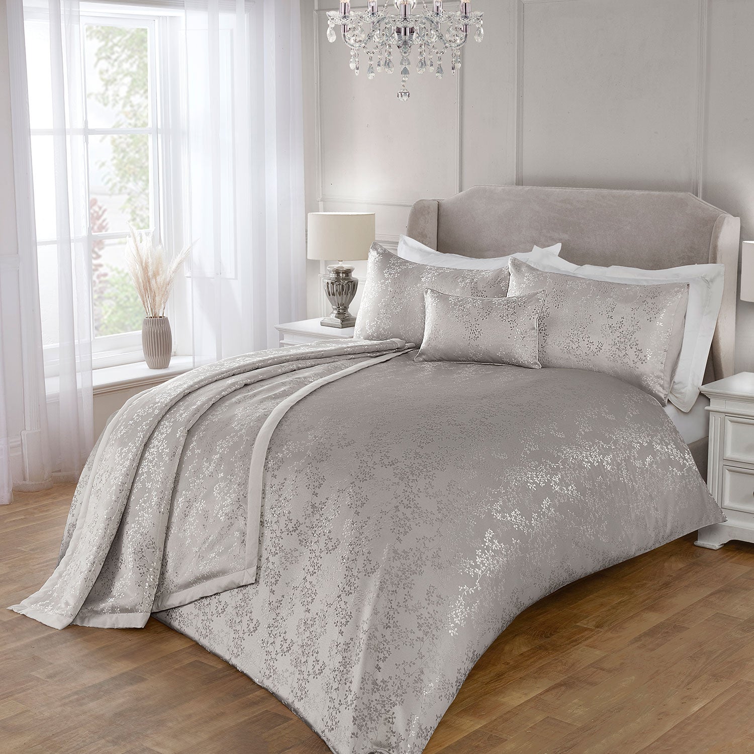 The intricate pattern adds a subtle sheen to create a luxurious look, while the soft, high-quality fabric ensures comfort and durability. Perfect for creating a serene and stylish sanctuary, the Melody Silver Jacquard Duvet Set is where comfort meets classic charm.