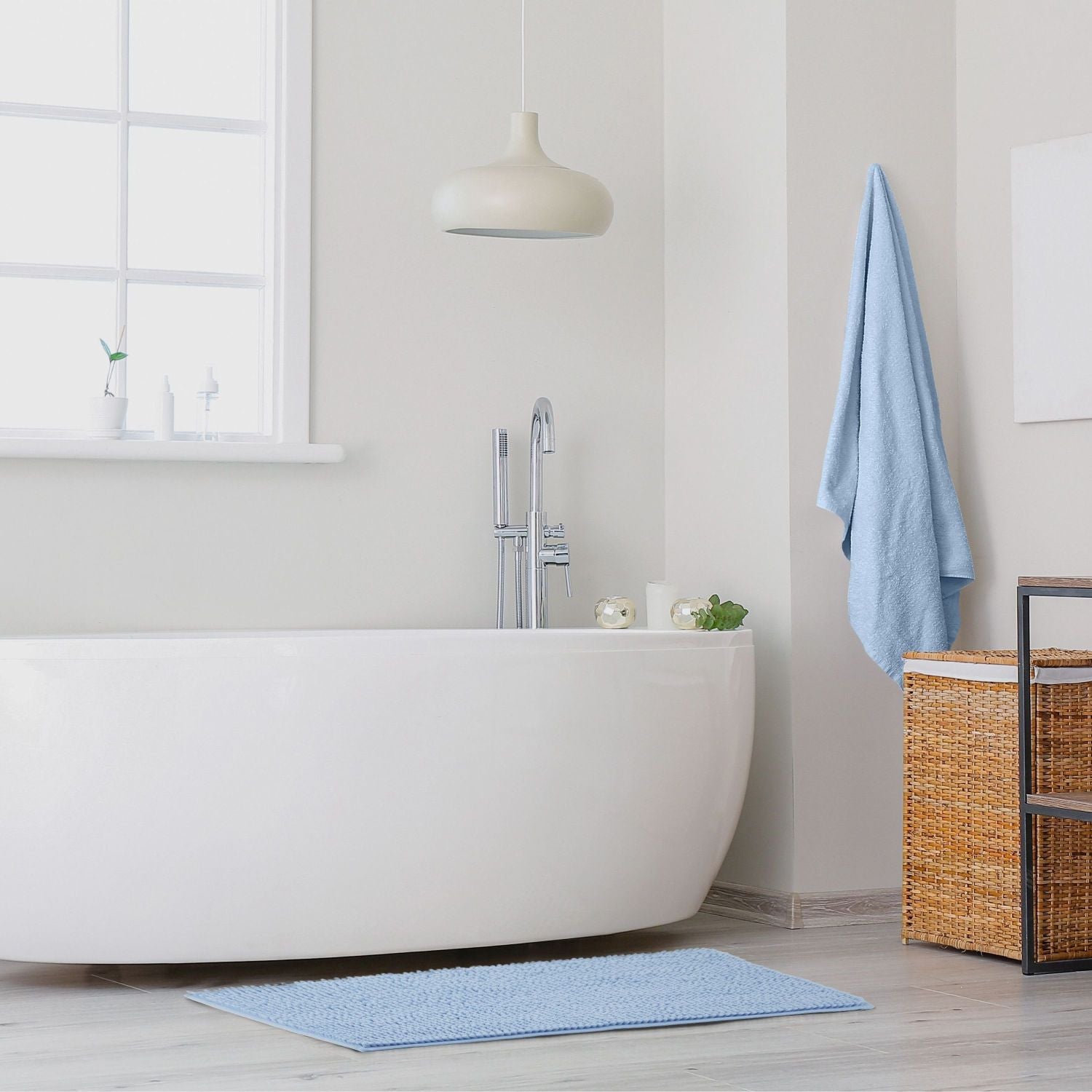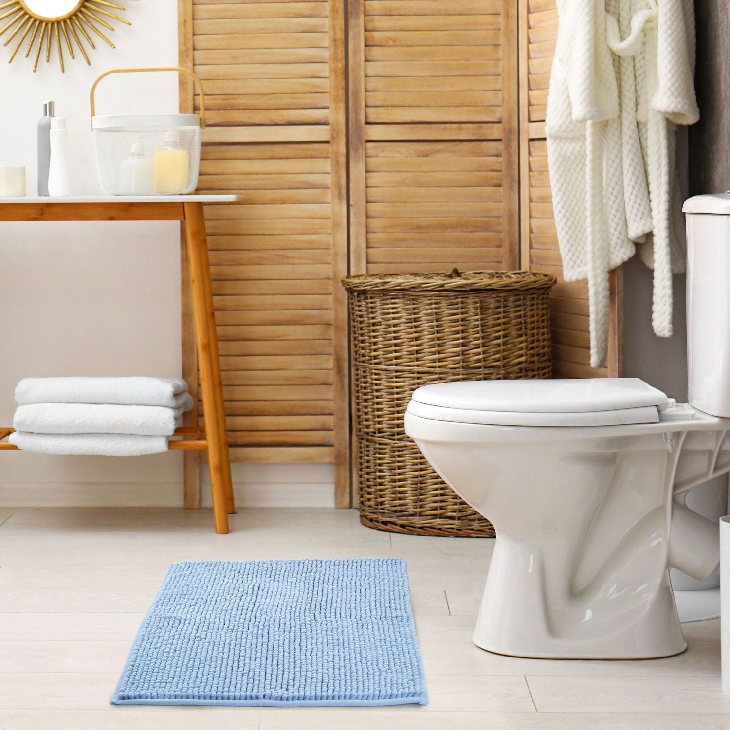 Introducing the Noodle non-slip chenille bath mat - perfect for use in front of your bath, shower, or sink. This quick-drying and super absorbent mat is machine washable and has a coated reverse to keep it in place, even when wet, for added safety. Plush tufts soak up water fast, and the durable construction ensures years of use.
