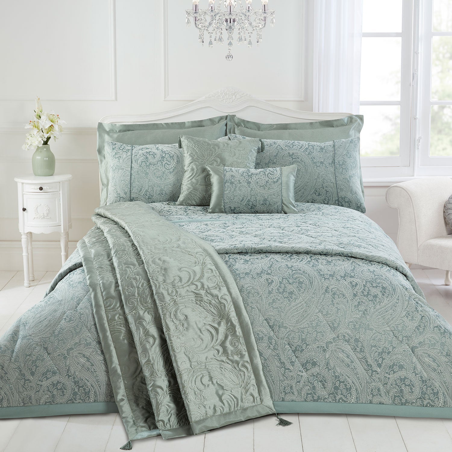 Featuring an intricate paisley design in rich soft green tones, these housewife pillowcases feature stunning rope detailing across the face. The pillowcases have a coordinating duvet set along with a wide range of matching accessories including a throw with corner tassels, a boudoir cushion, a square cushion with corner tassels and oxford pillowcases. Combine all of the elements to create a beautiful and elegant statement look in your bedroom.