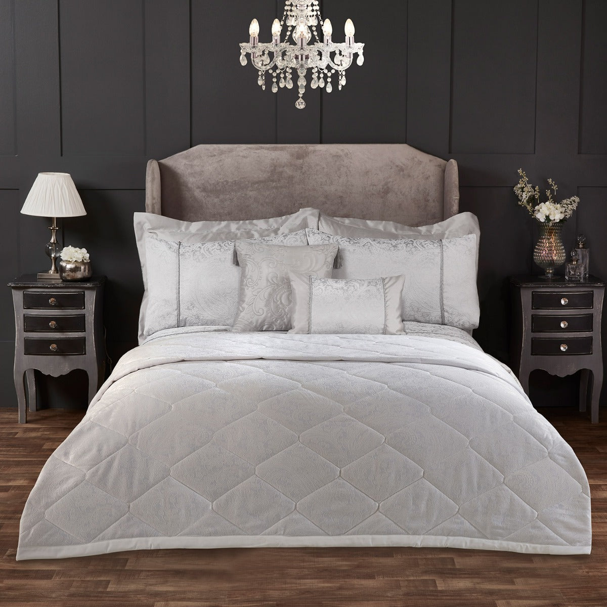 Featuring an intricate paisley design in stunning silver, this generously sized bedspread is quilted into diamonds and provides a stunning way to layer up your bed. The bedspread has a coordinating duvet set along with a wide range of matching accessories including a throw with corner tassels, a boudoir cushion, a square cushion with corner tassels and housewife and oxford pillowcases. Combine all of the elements to create a beautiful and elegant statement look in your bedroom.