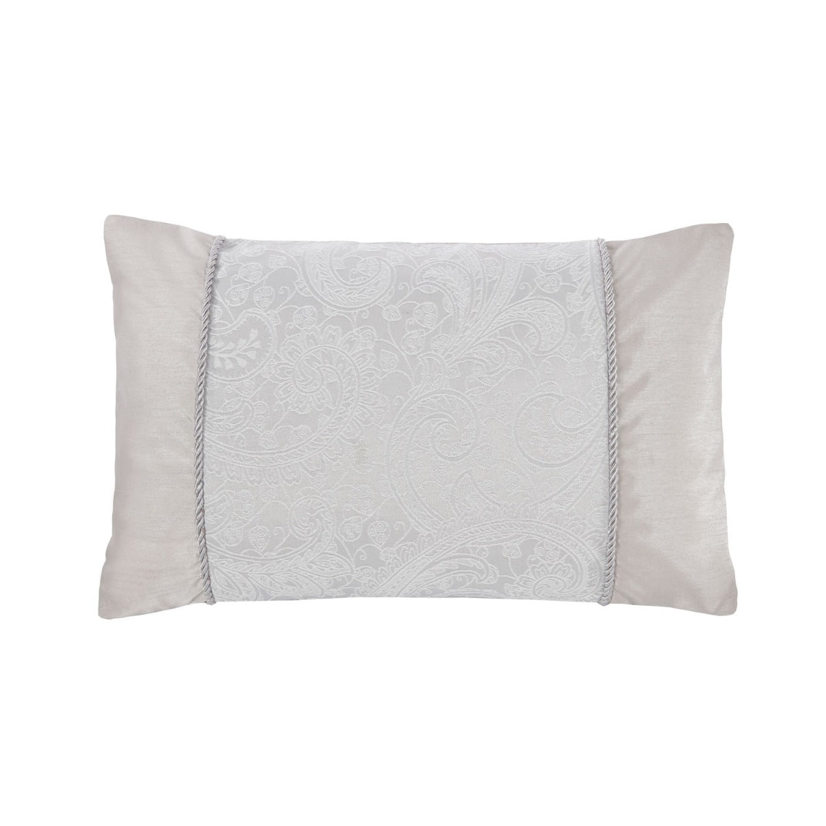 Featuring an intricate paisley design in contemporary silver tones, this pretty boudoir cushion features stunning rope detailing between the paisley panel and satin cuffs. The cushion has a coordinating duvet set along with a wide range of matching accessories including a throw with corner tassels, square cushion with corner tassels and housewife and oxford pillowcases. Combine all of the elements to create a beautiful and elegant statement look in your bedroom.