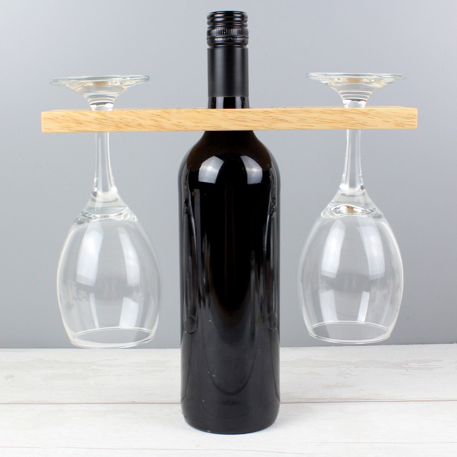 Place this butler over a bottle neck. It holds two stem glasses by balancing one on each side.