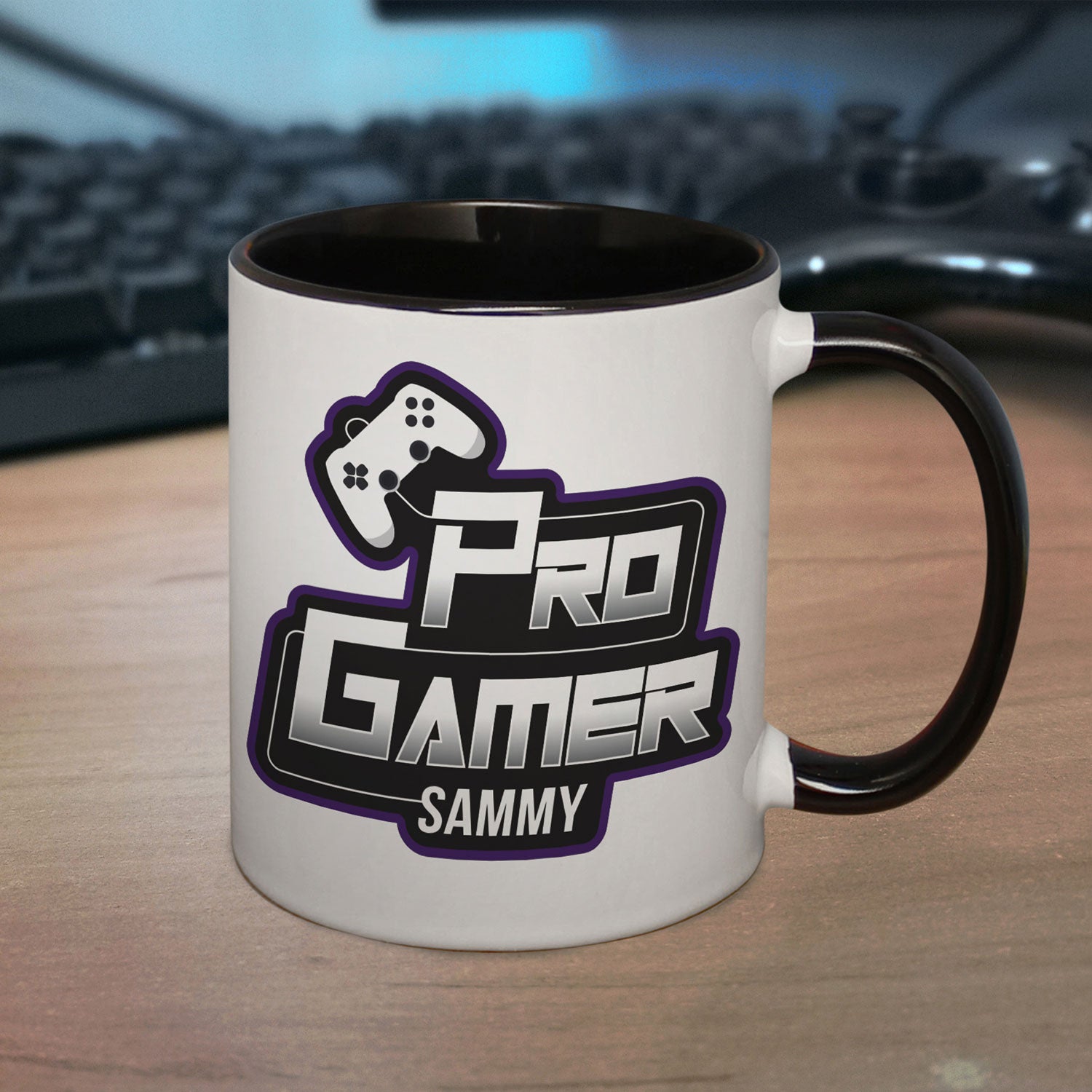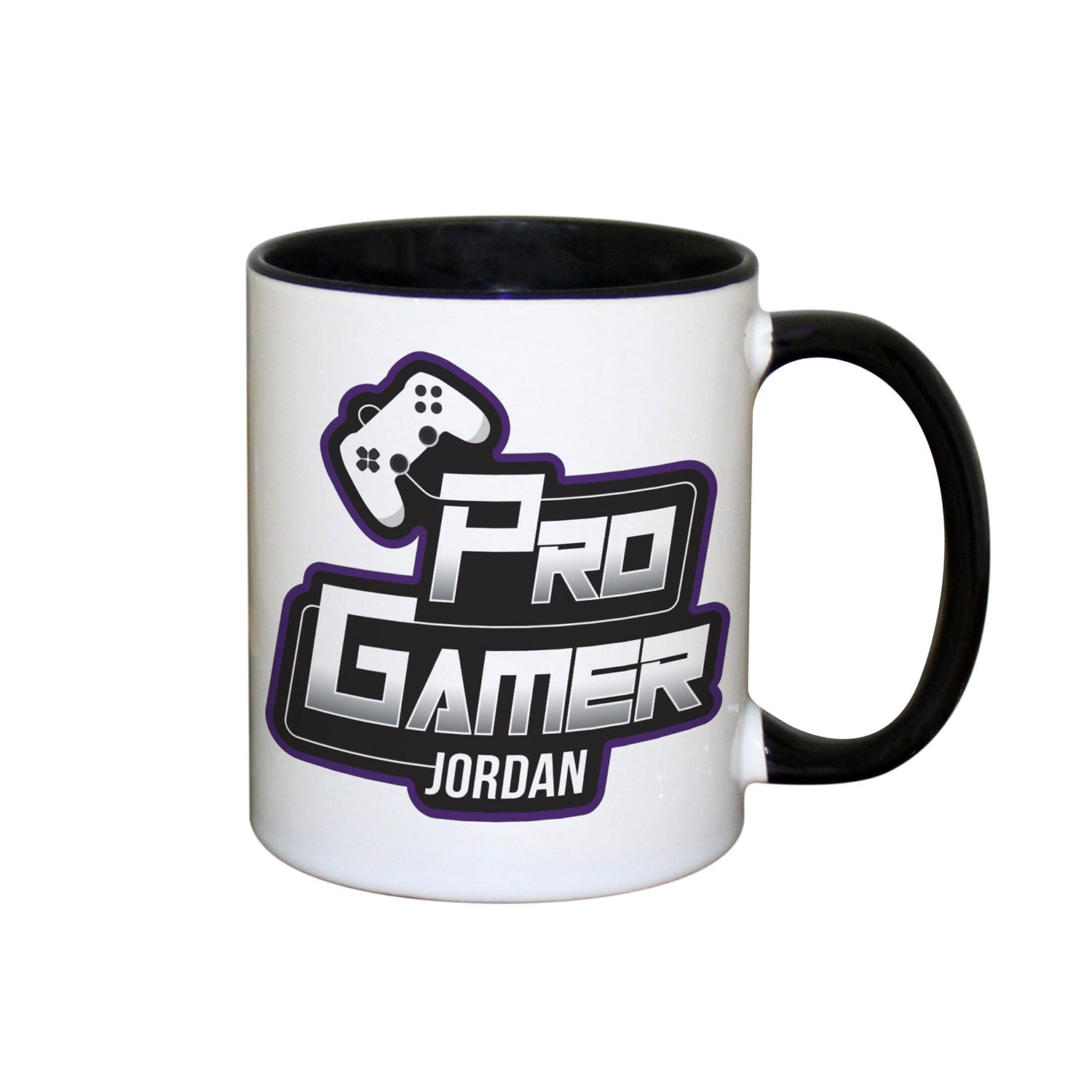 The name will appear below the controller and fixed text "Pro Gamer" The 11oz black inside mug is 9cm tall, 11cm wide (including handle) and 8cm diameter. We recommend hand wash only.