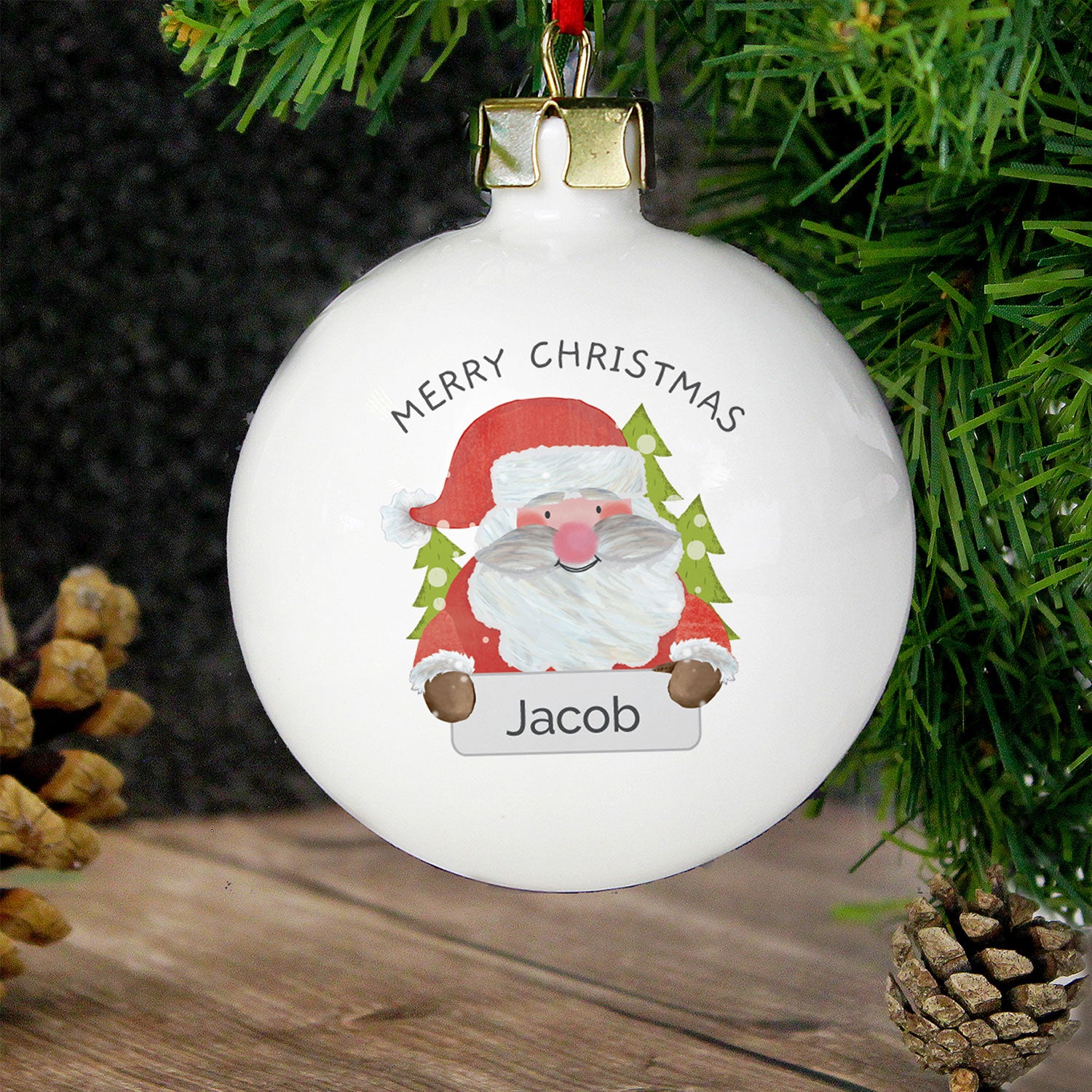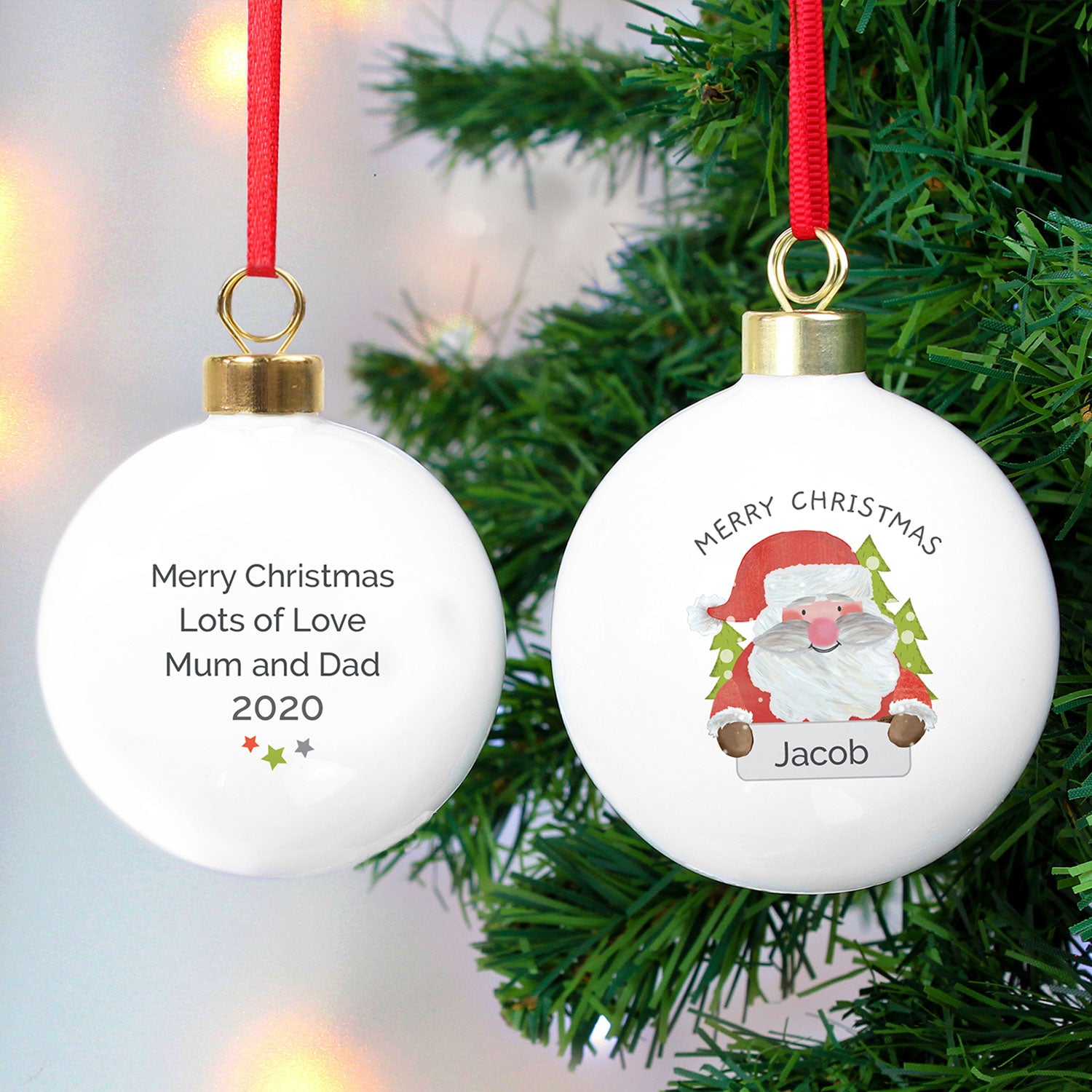 Our Personalised Santa Bauble is a lovely gift this Christmas. Personalise this bauble with a name up to 12 characters on the front of the bauble and 4 lines on the reverse, 15 characters per line. All personalisation is case sensitive and will appear as requested. The bauble comes supplied with a ribbon ready to hang straight onto the tree. The colour of the ribbon may vary.