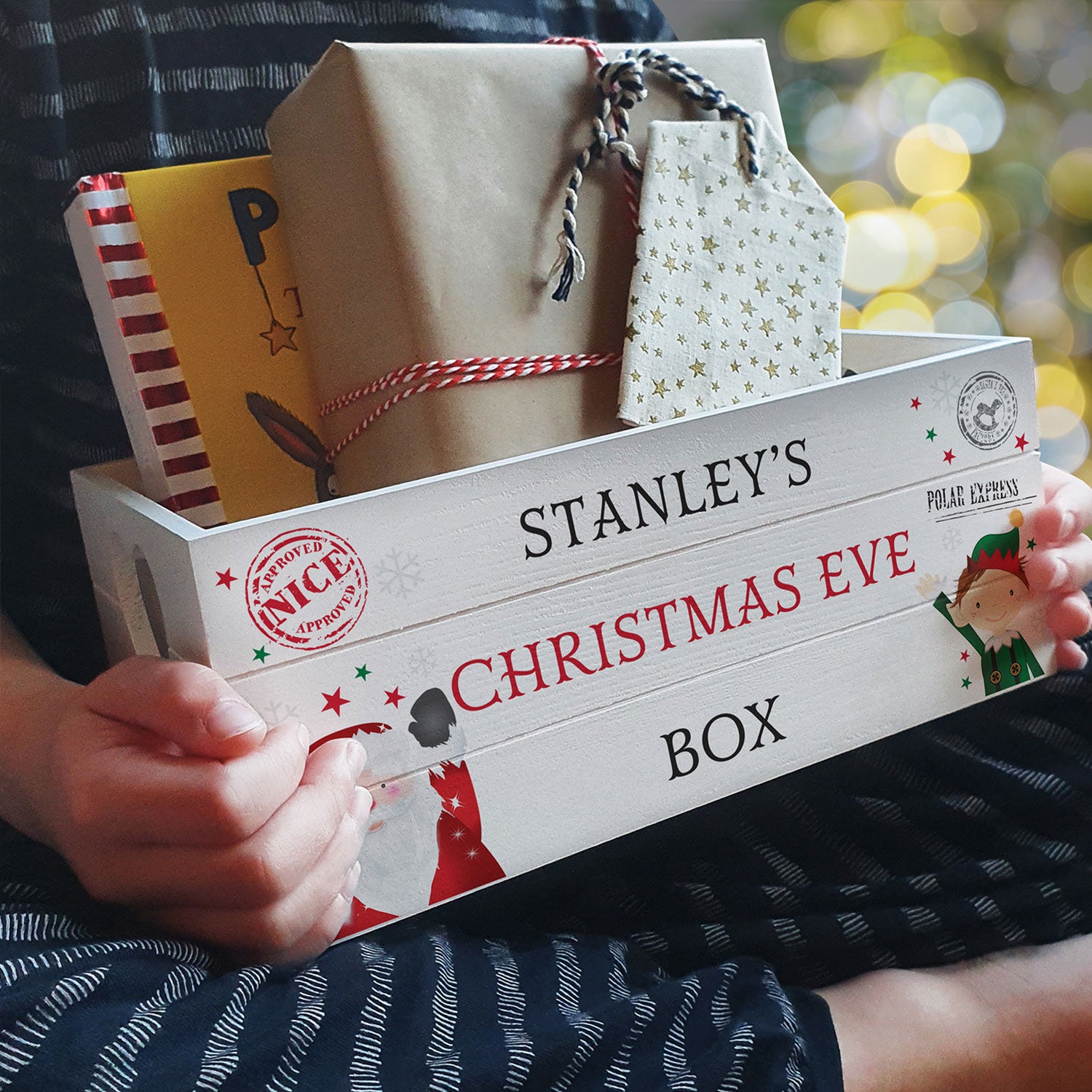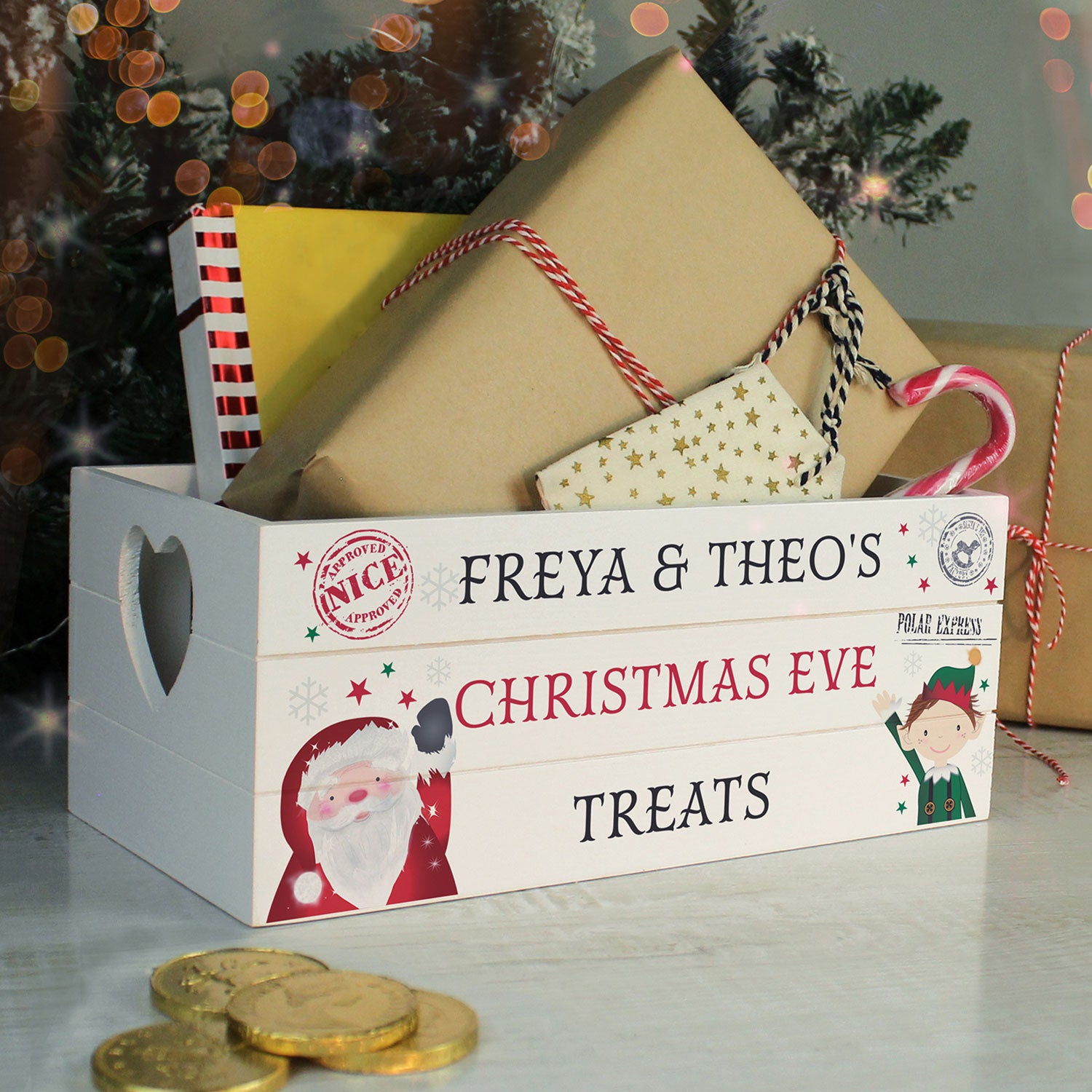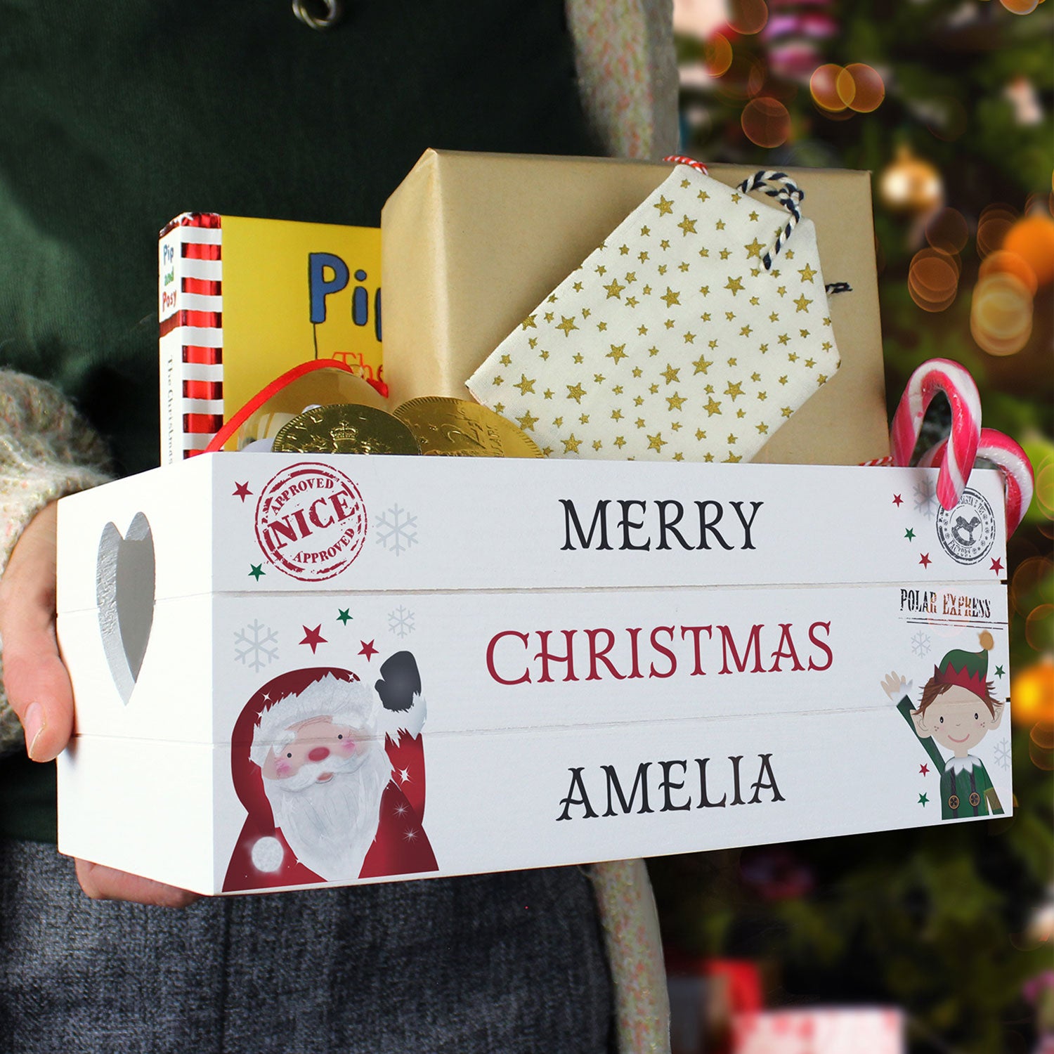This personalised white small Christmas wooden crate is a great way to present Christmas Eve sweets and treats! You can personalise this wooden crate with up to 3 lines of text, each line has up to 15 characters available. The personalisation will appear in fixed uppercase. Material is reclaimed wood therefore minor imperfections may occur. Features heart shaped handles.