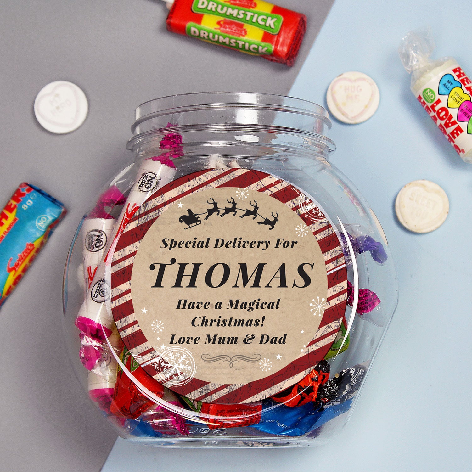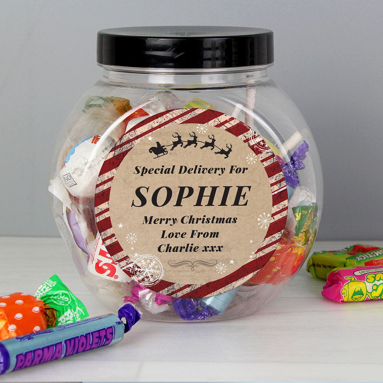This personalised sweet jar is an ideal Christmas gift for anyone little one with a sweet tooth! This sweet jar can be personalised with a name up to 12 characters and a message over 3 lines with up to 20 characters available per line. The text 'Special delivery for' is fixed and cannot be amended. Personalisation will appear in fixed upper case on the name and will appear as entered on the message.