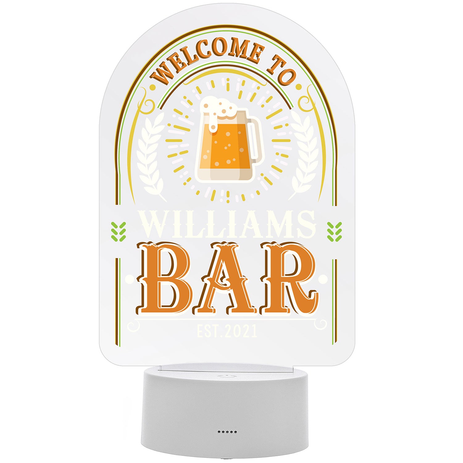 This light can be personalised with a name or role up to 12 characters long and a message line up to 25 characters long. Please enter the 's if required. Please note the personalisation will appear in fixed uppercase. "Welcome to... bar" is fixed text and cannot be changed.