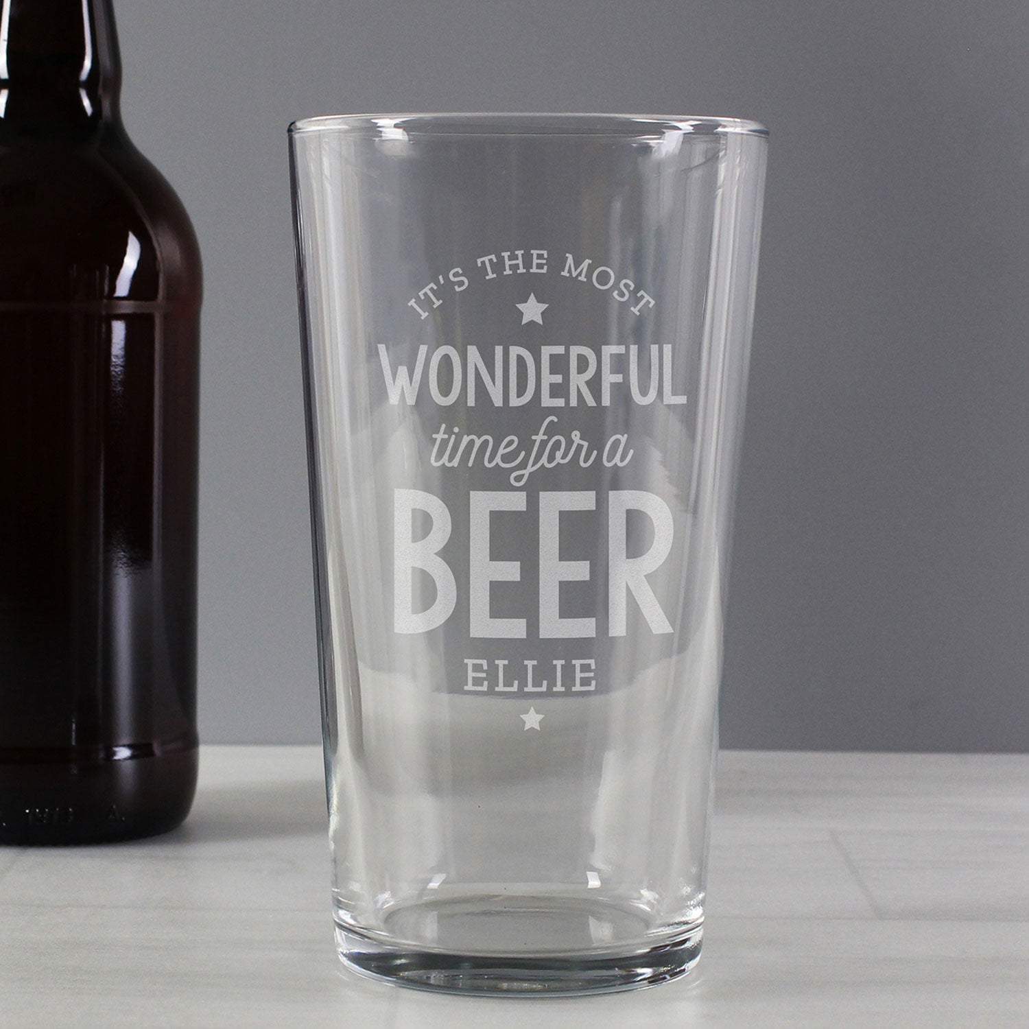 Personalise this pint glass with a name up to 12 characters. Please note that the words 'It's the most wonderful time for a beer' is fixed and cannot be amended. All personalised text will appear in fixed upper case.