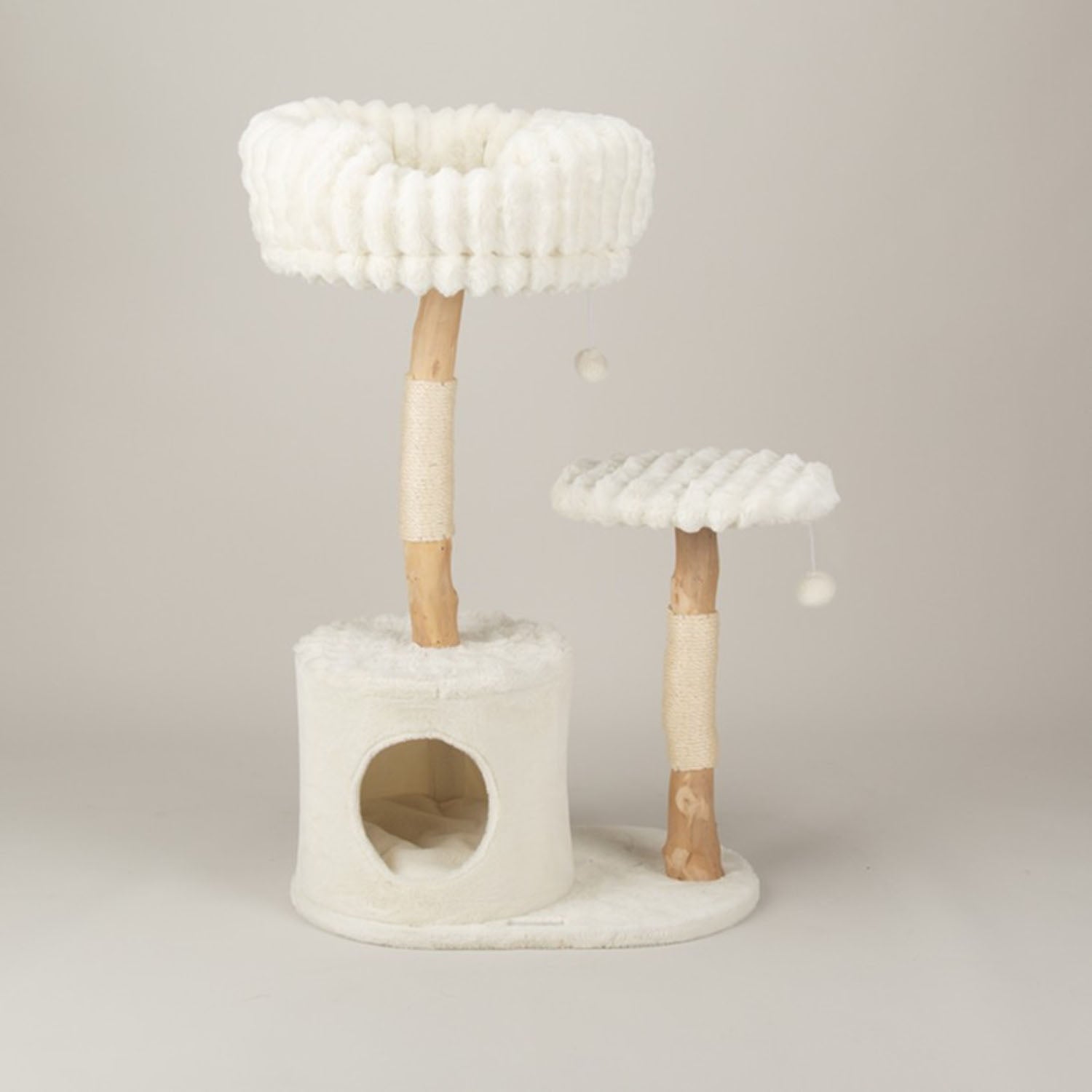 This multi-functional tree is designed for comfort and activity. It features a snug hideaway for undisturbed naps, a high bed for relaxed viewing, and a durable scratch post for healthy claws. Layered perches promote climbing and gentle exercise, while plush cushioning supports joints and muscles.