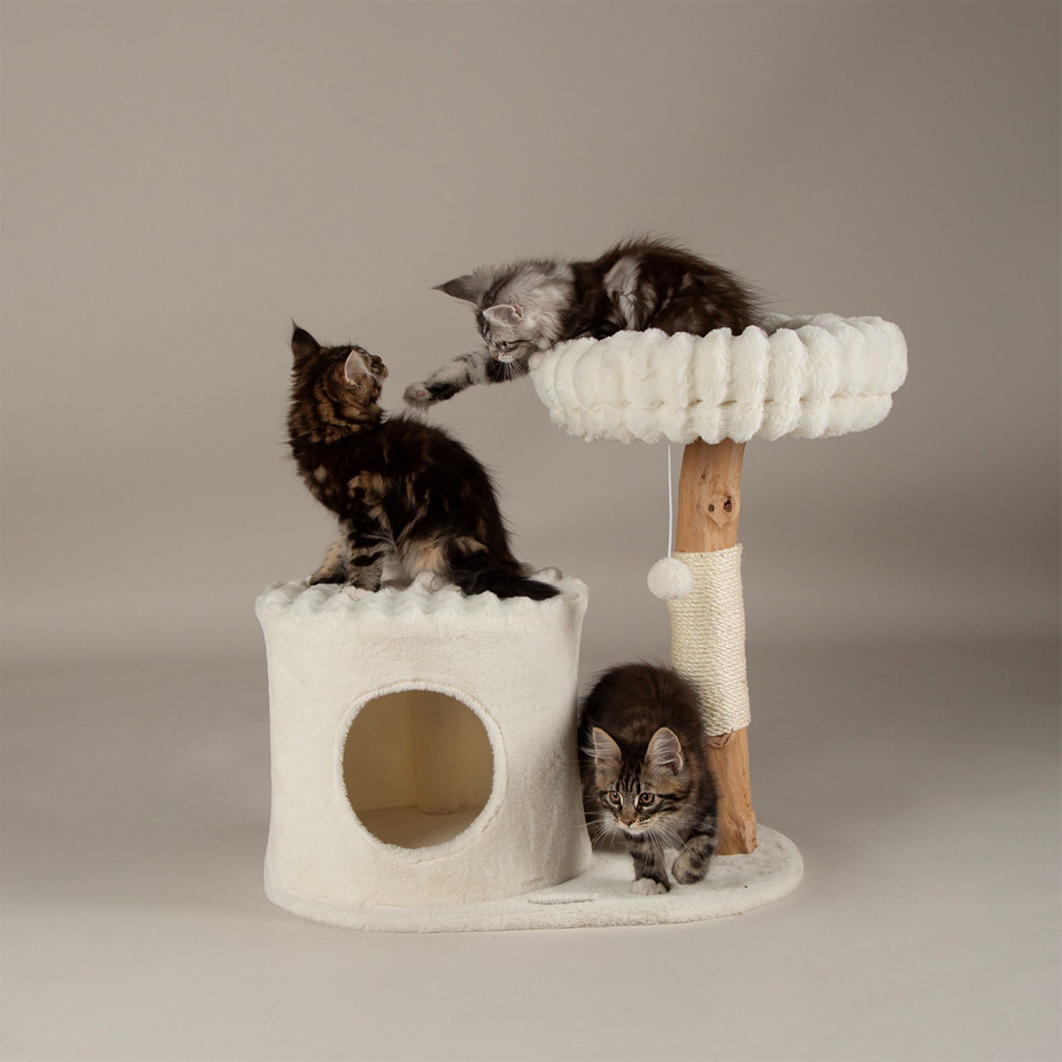 Composition: Plush fabric: 100% Polyester Posts: Pear wood Base/Platforms: Chipboard Rope: Sisal Filling: 100% recycled polyester fibre