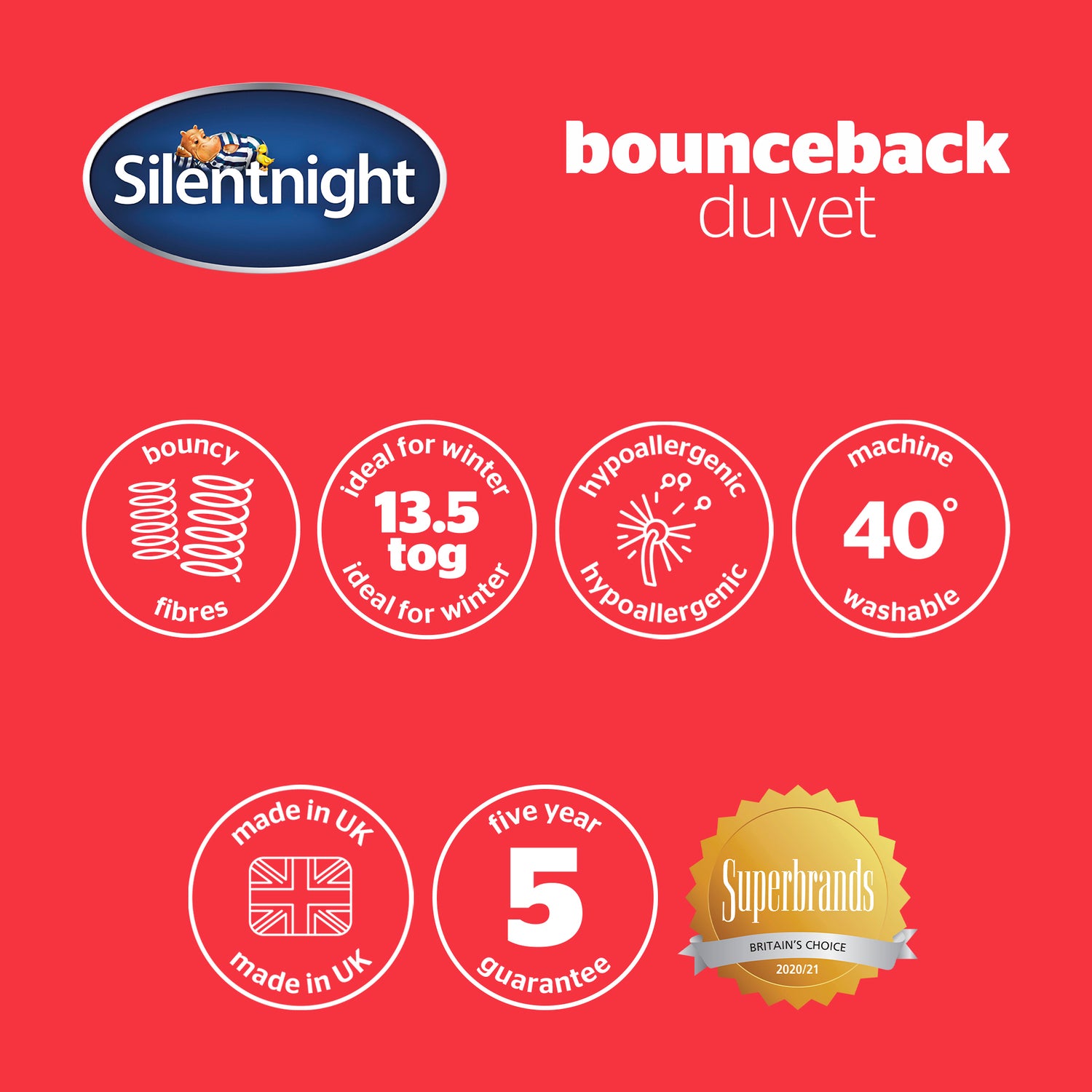Enjoy endless comfort with bouncy fibres that rebound night after night. The Silentnight Bounceback Duvet is generously filled with spring like fibres that bounce back into shape every morning. This helps to keep your duvet feeling sumptuously fuller for longer.