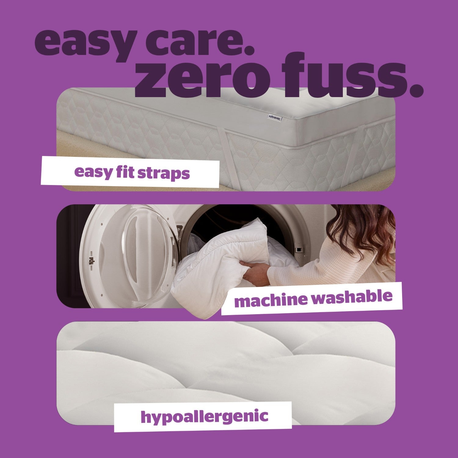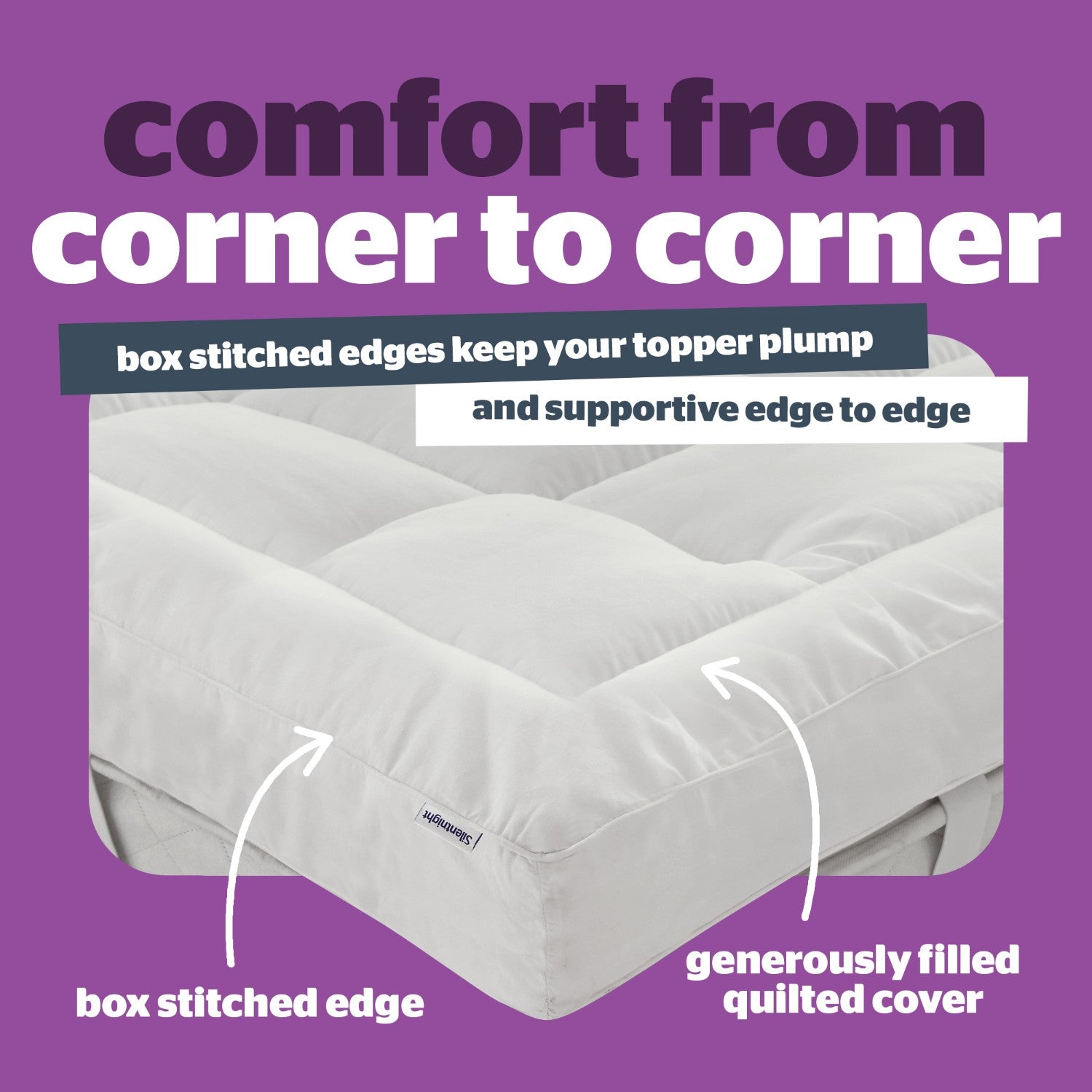 The specially constructed box stitched edge offers long-lasting shape and edge-to-edge plumpness, whilst the unique quilted design keeps the filling in place. The soft, bouncy fibres keep your topper feeling plush and plump, providing gentle support and an added layer of comfort, helping you wake up feeling refreshed.