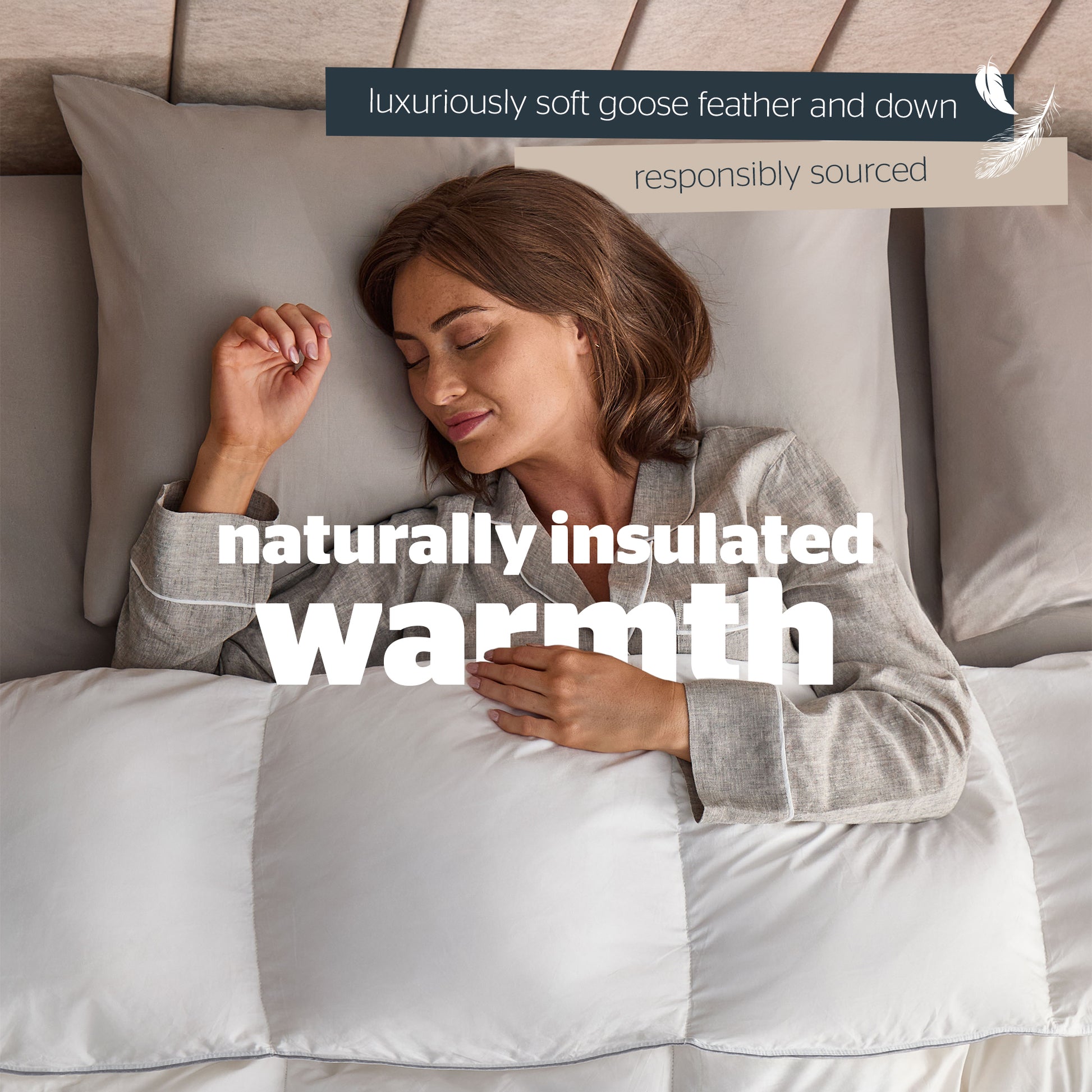 Deeply filled with premium white goose feather and down for superior warmth, encased in 100% cotton for serene, natural comfort. The Silentnight Naturals Goose Feather and Down Duvet is crafted with luxuriously soft, natural goose feather and down to help you unwind into a deeper, more serene sleep.