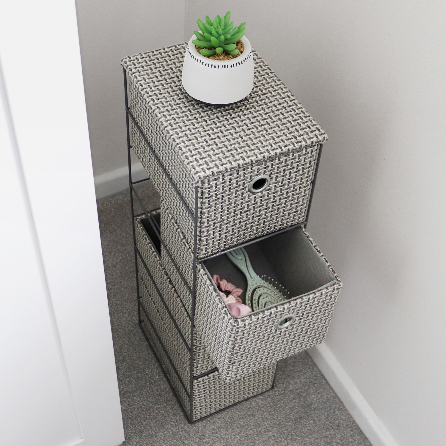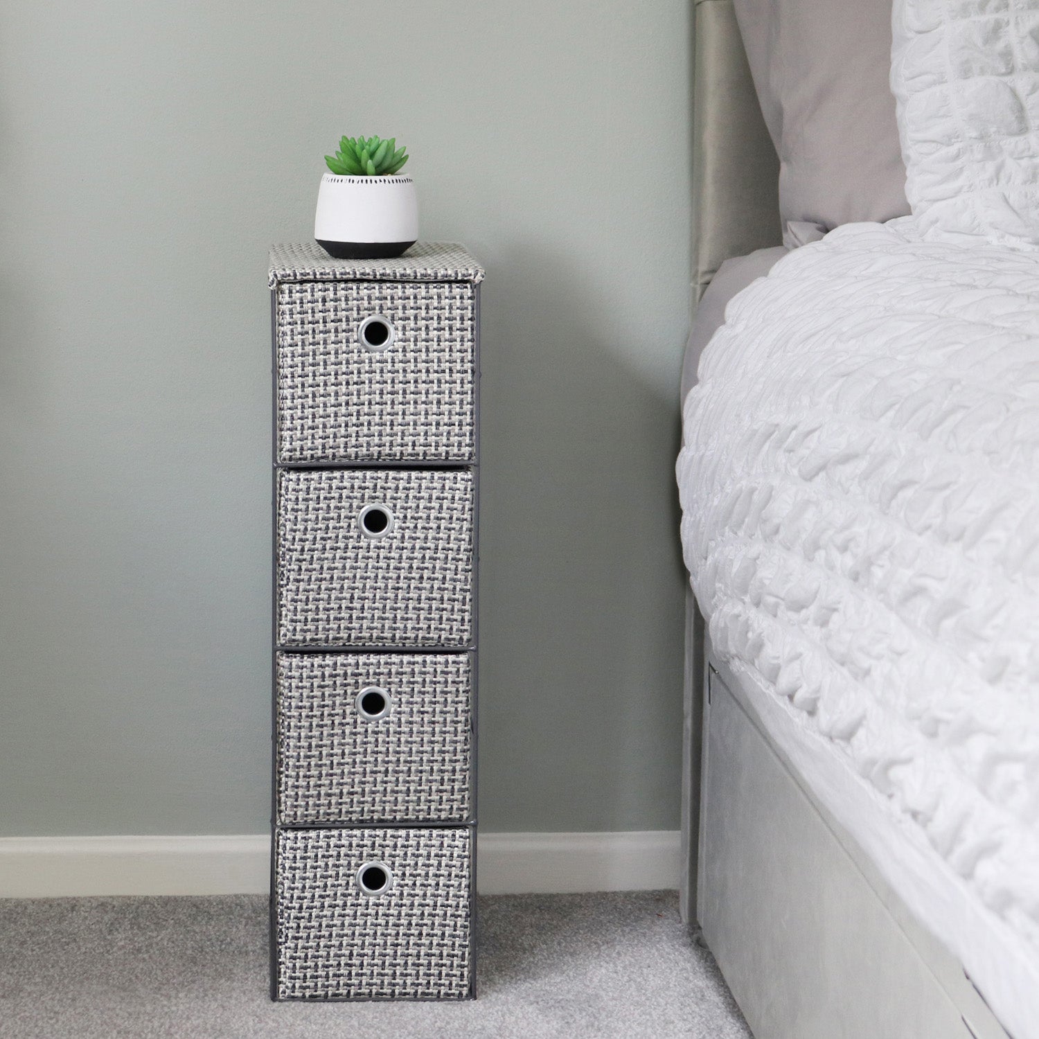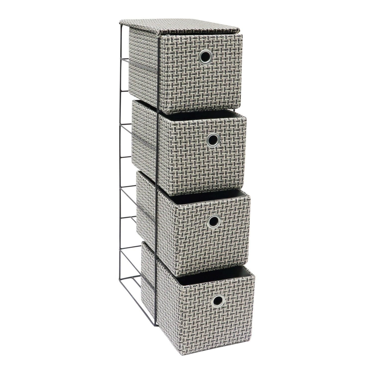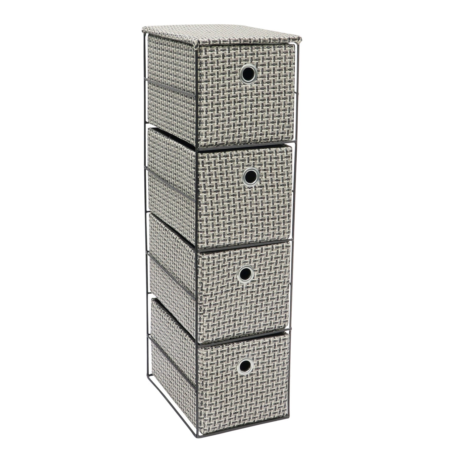 • Durable 4 drawer narrow fabric storage tower.