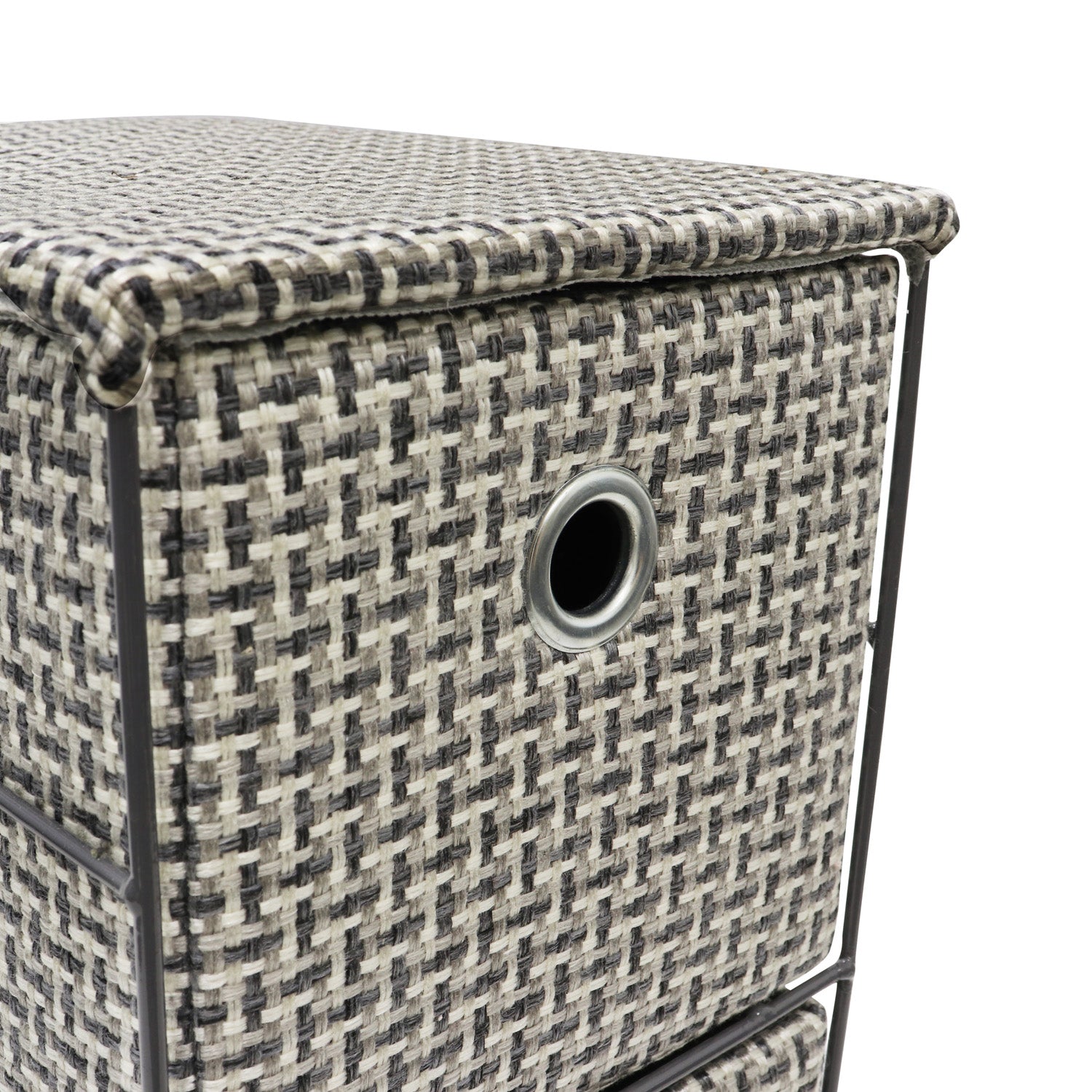 Material: Painted metal frame, cardboard drawer with fabric covering 100% polyester