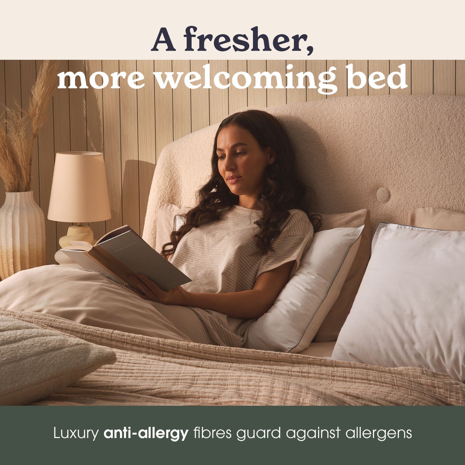 Providing gentle support, the pillow softly cushions your head and neck while pure cotton fibres allow air to circulate freely, ensuring comfort that feels cool and fresh throughout the night. Filled with luxurious anti-allergy fibres that help guard against allergens, it also ensures a welcoming sleep environment.