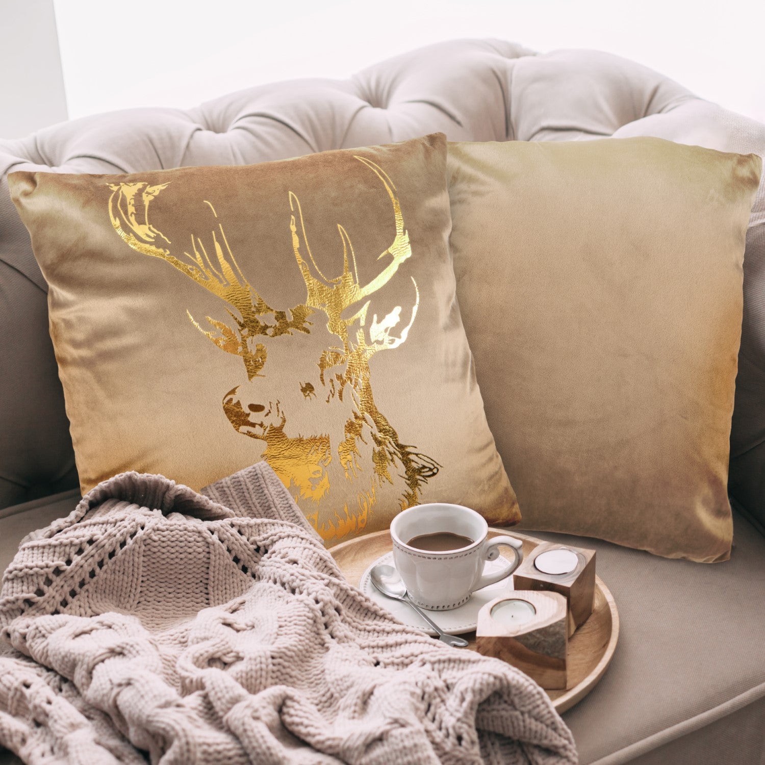 These luxurious velvet cushion covers feature a sophisticated metallic stag motif, adding a touch of elegance to your home this season. Available in two sizes.