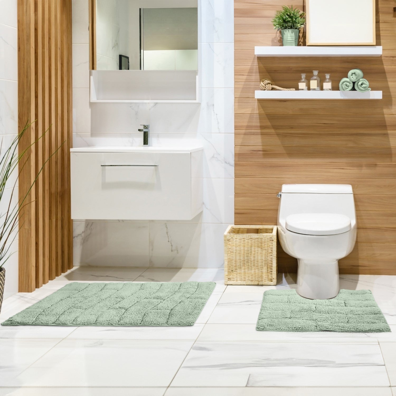 The plush cotton surface quickly absorbs water and dries fast, ensuring comfort from one use to the next. Crafted from incredibly soft cotton, this luxurious mat set includes both a pedestal mat and a bath mat. The coated reverse of the bath mat keeps it securely in place, even when wet, providing added safety.