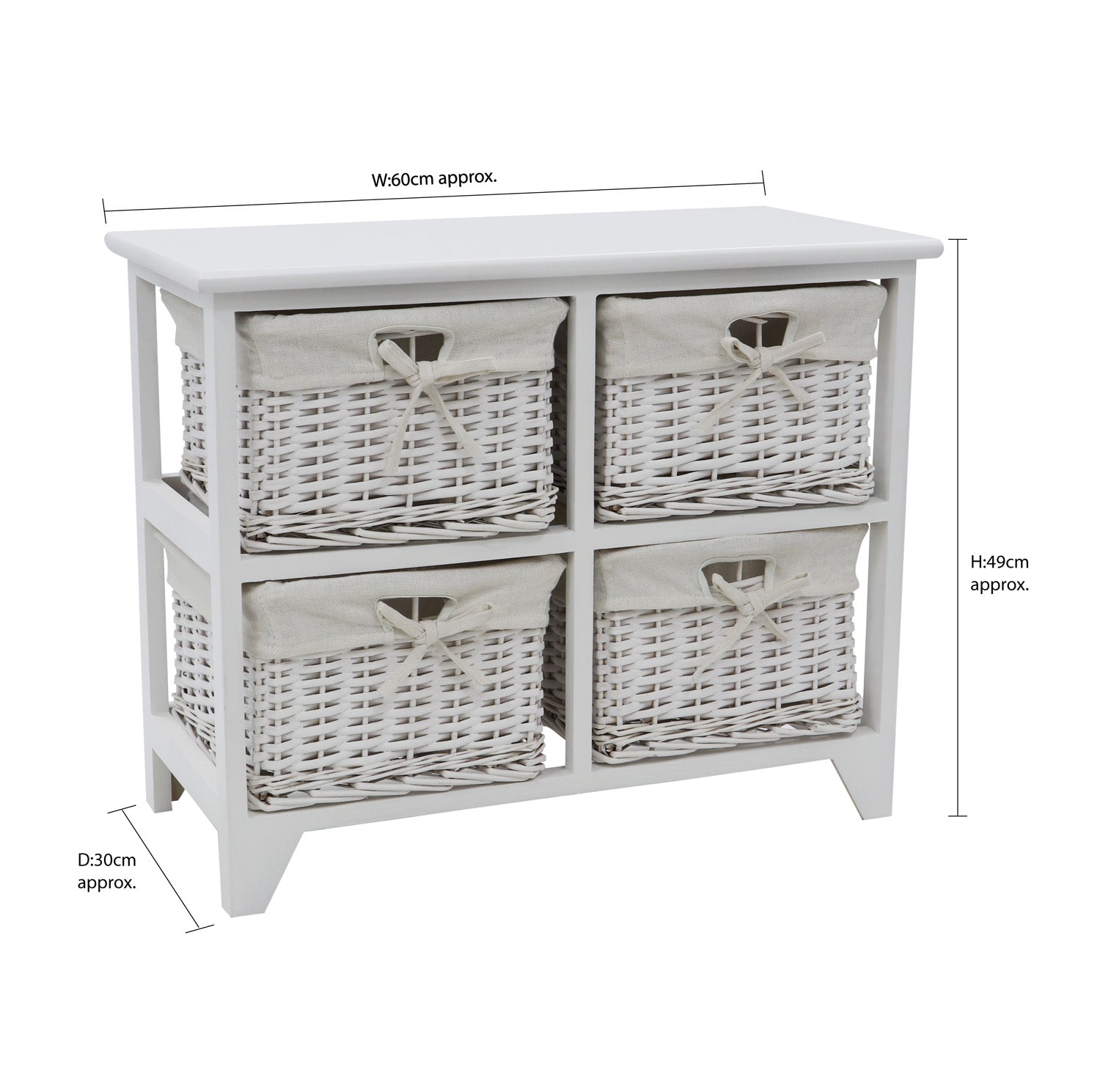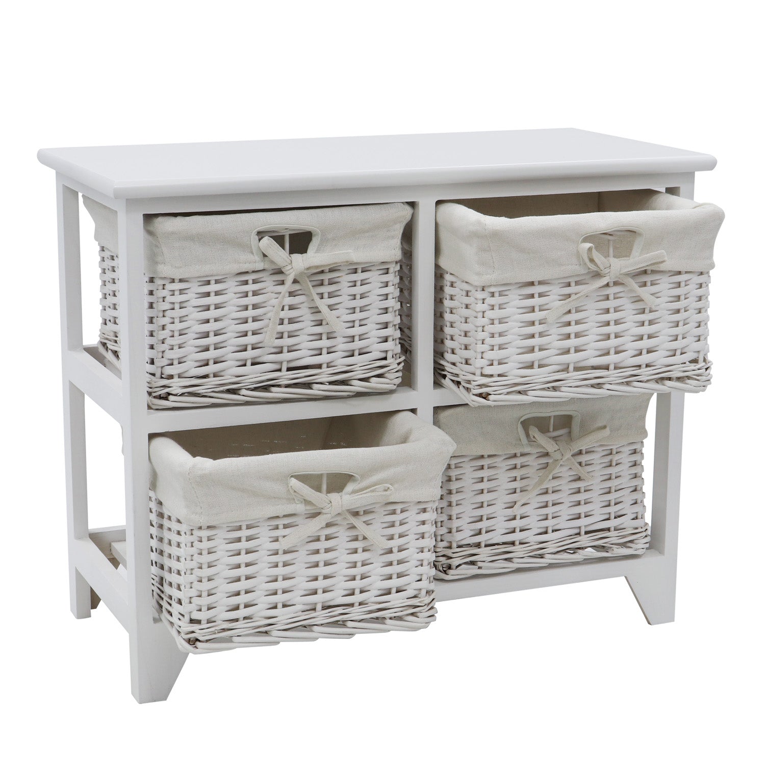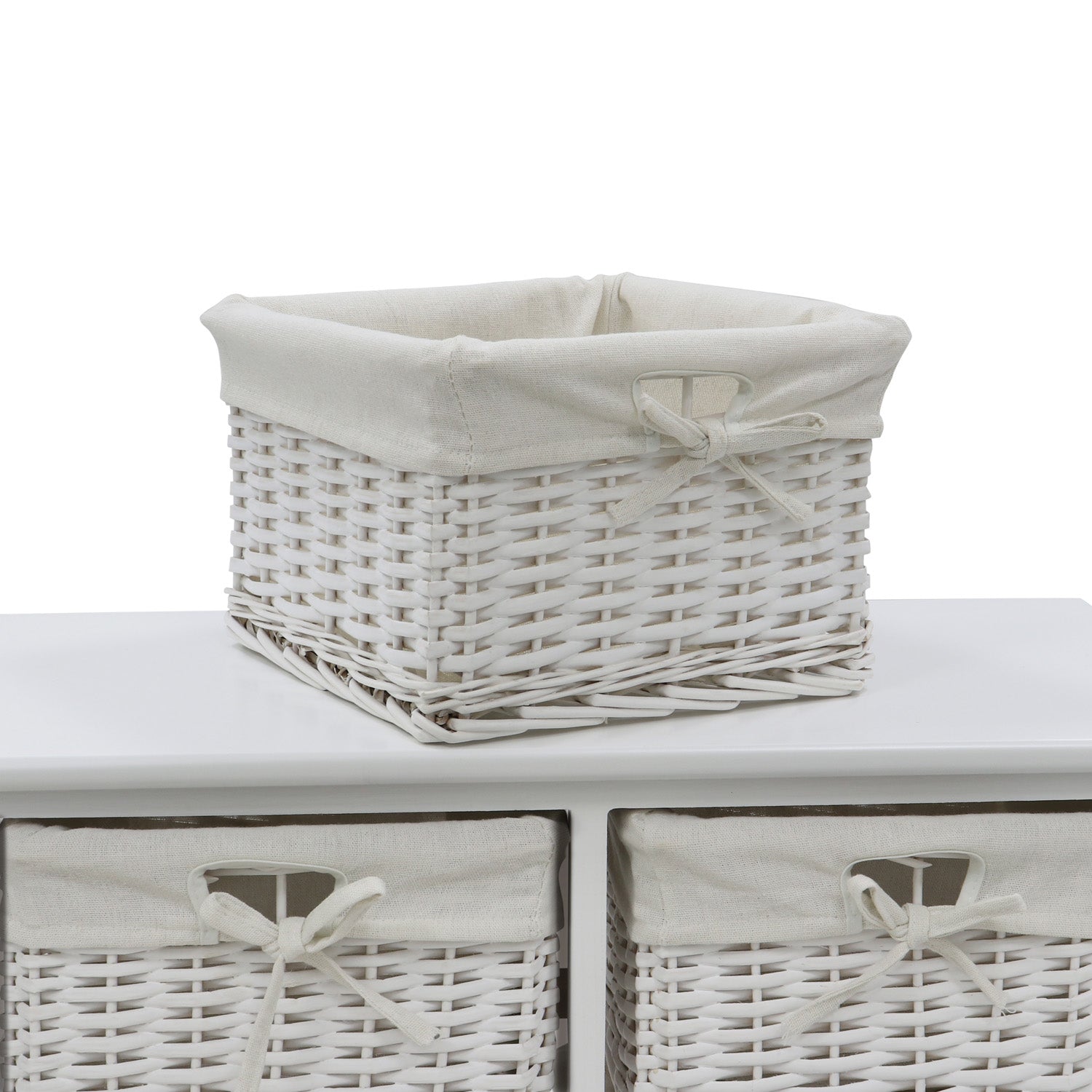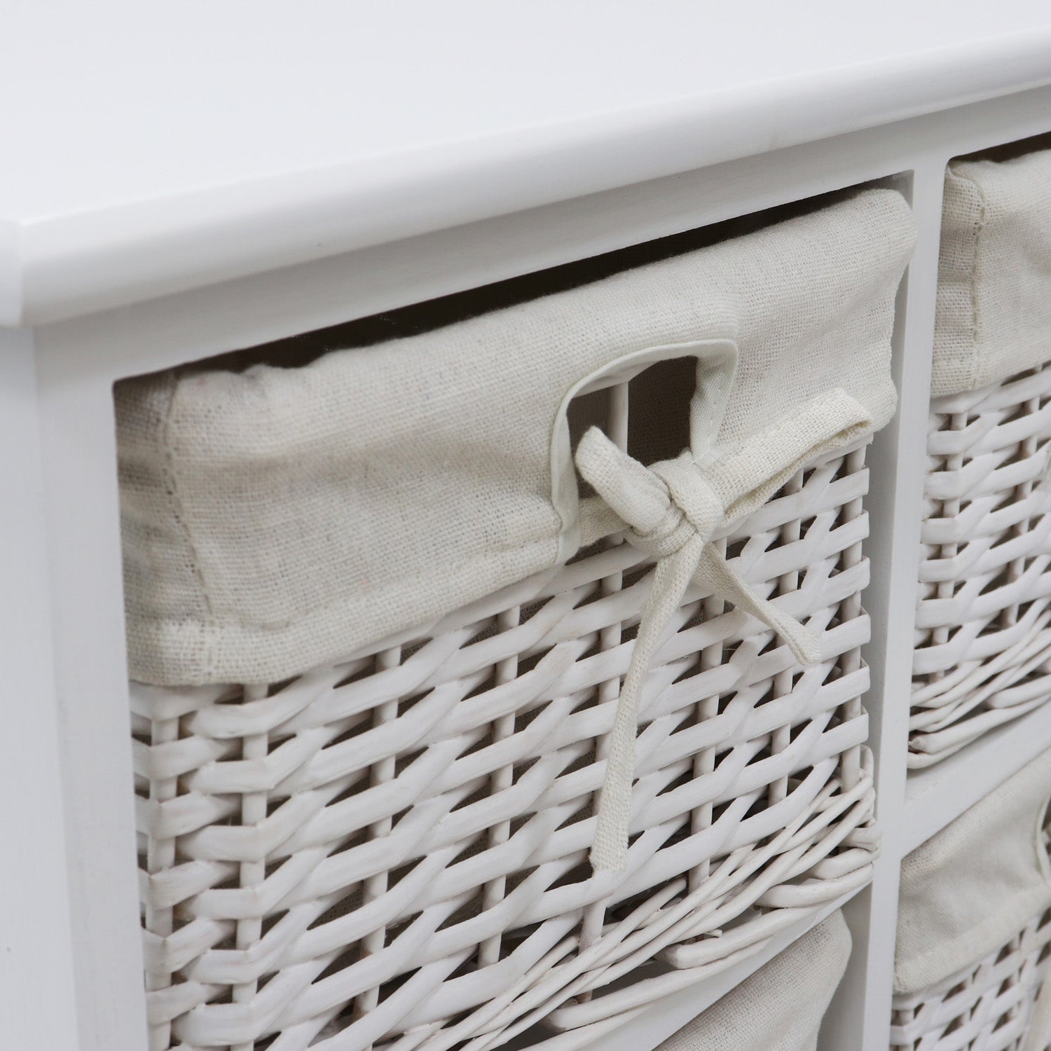 Each basket has a white cotton liner with a front bow, while the frame is made from wood with a white satin finish, making it ideal for your living area. Each basket can be removed from the unit with ease, and you can separate the liners to wash them, keeping the unit looking fresh all the time.
