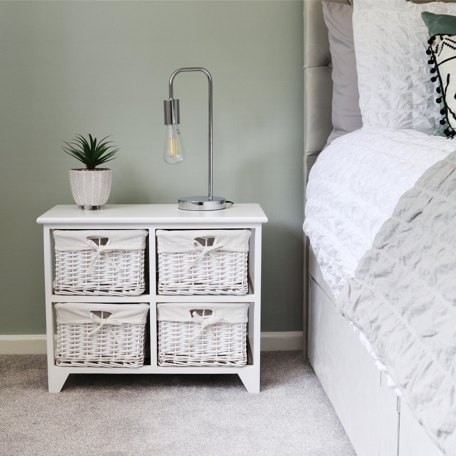 • Four whitewashed Willow baskets sit side by side to create a wide storage unit.