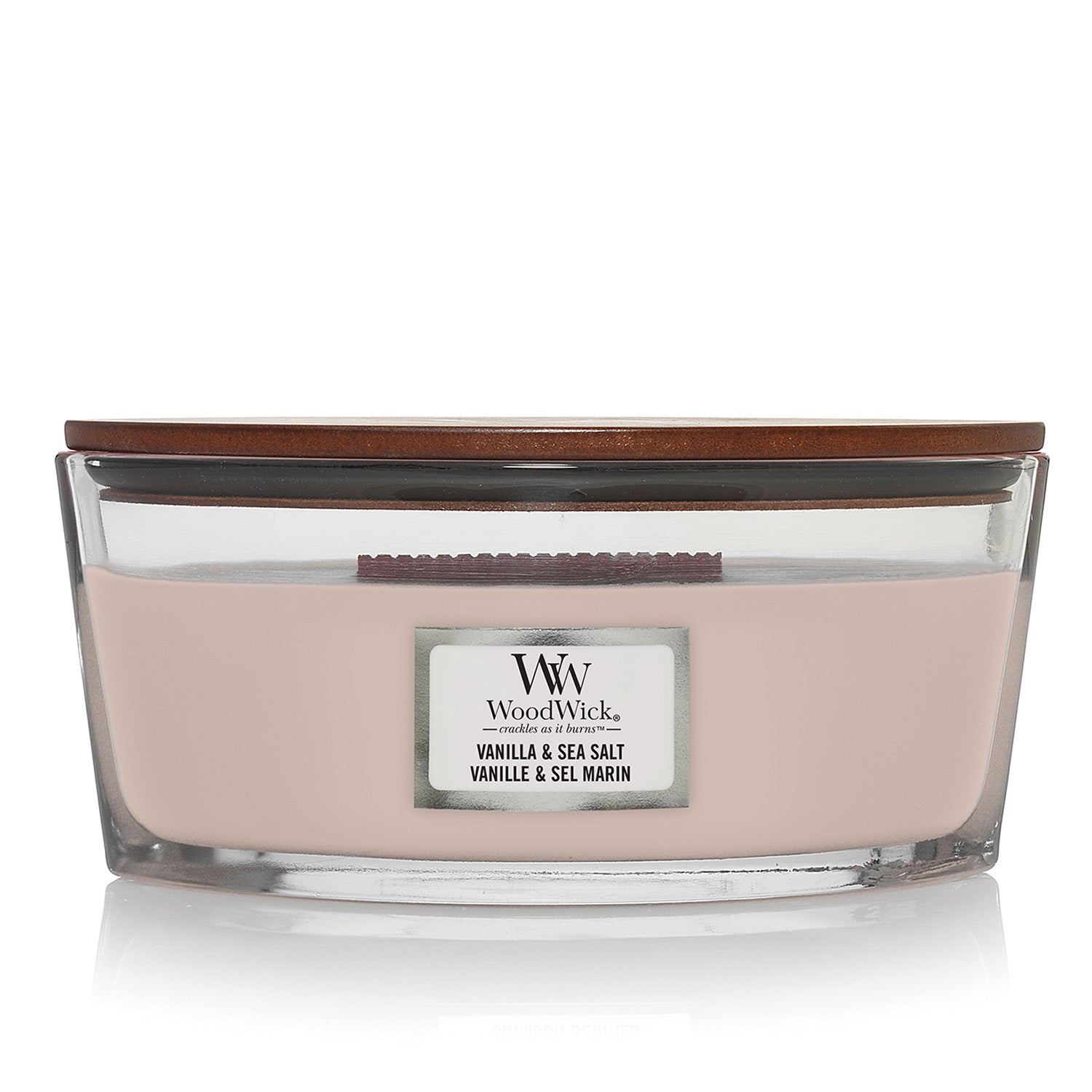 The scent of soft vanilla blossoms swirled with notes of sea salt and jasmine. Ellipse Woodwick Candles fill your home with sophisticated scents and a soft crackle from a natural wooden wick that Crackles as it burns